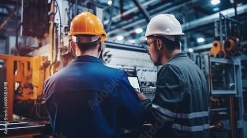 Engineers and factory managers wearing safety helmet inspect the machines in the production. inspector opened the machine to test the system to meet the standard. machine, maintenance