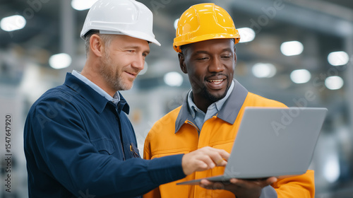 employee, collaboration, factory, engineer, technician, laptop, teamwork, discussion, workplace, professional, technology, manufacturing, engineering, problem solving, communication, safety-gear, job site, workflow, innovation, preparedness