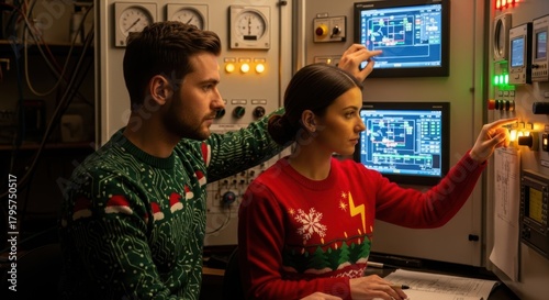 engineer, machinery, christmas, sweater, industrial, plant, holiday, equipment, man, woman, reviewing, working, maintenance, schedule, monitor, screen, industrial plant, technician, female, male, together, collaboration, technology, manufacturing, camaraderie, operation, system, power, factory, control panel, discussion, professional, occupation, confident, expertise, teamwork, safety, production, winter, cheerful, industry, infrastructure, work, inspection, uniform, video