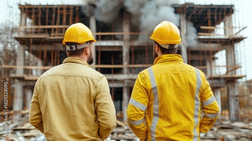construction site, fire, building, burning, engineer, safety, damage, accident, construction, helmet, men at work, industry, inspection, risk, emergency, problem, architecture, disaster, insurance, loss, prevention, workplace, hazard, control, investigation, assessment, analysis, smoke, flames, destruction, real estate, development, project, bankruptcy, responsibility, liability, professional, job, occupation, structure, teamwork, collaboration, backview, outdoors, daytime, examining, observing, analysing
