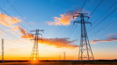 electricity, sunset, silhouette, pylon, high voltage, field, powerline, landscape, teamwork, technology, twilight, energy, engineering, infrastructure, professional, connection, safety-gear, horizon, communication, sun ray, nature, maintenance, industry, rural, labor, work, environment, transmission, sky, craftsmanship