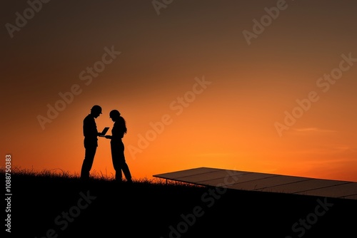 Engineers team survey check solar panel roof installation with laptop and tablet. Specialist technician maintains solar roof panel on factory rooftop.