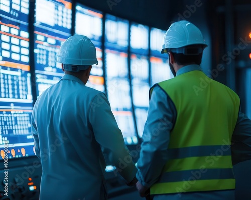 Engineers working on nuclear reactor designs with radiation safety and cost breakdowns on holographic displays, nuclear power, engineering safety