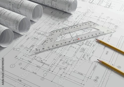 Engineer's workspace with blueprints, a set square, and pencils, illustrating the detailed planning and creation process