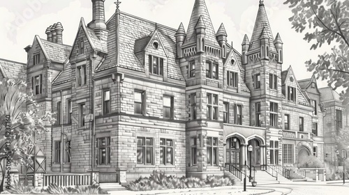 Engraving of a historic university building with intricate architectural details. stock photo --ar 16:9 --style raw --v 6 Job ID: f9035ac9-1099-4afa-ba1f-b5432bf3ce27