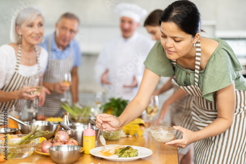 Engrossed young Asian woman honing cooking skills during group culinary classes, garnishing and seasoning finished dish with sauce before presentation..