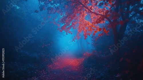 forest, path, autumn, leaf, red, blue, mist, fog, skittish, mystical, magical, dark, night, tree, wood, nature, landscape, scenery, mysterious, eerie, creepy, scarey, halloween, fantasy, vibrant, colourful, orange, glow, light, shadow, deep, tranquil, serene, dreamy, pathway, way, trail, journey, adventure, exploration, mood, atmosphere, ambience, setting