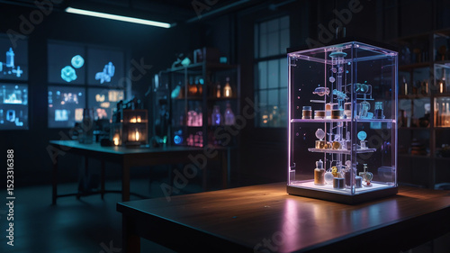 Enigmatic Chemistry Lab Illuminated Glass Display Case with Intriguing Experiments