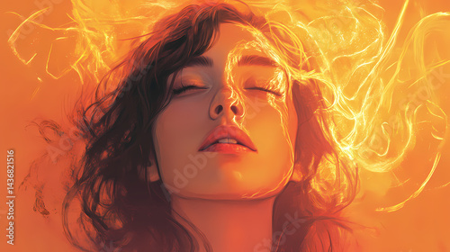 Enigmatic portrait of a woman with ethereal energy swirling around her, showcasing inner light and cosmic connection, conveying spirituality and consciousness. Inner Light. Illustration