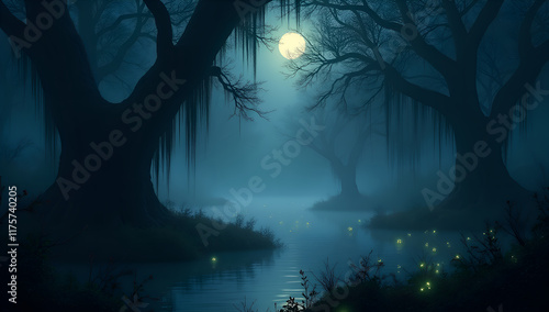 mystical, forest, moonlight, river, tree, night, glow, eerie, calmness, magic, shadow, branch, sky, nature, mysterious, illumination, mist, water, enigmatic, peaceful, dreamlike, aethereal, atmosphere, fantasy, twilight, wilderness, calm, serene, overcast, dark, secret, beauty, landscape, adventure, enchanting, aglow, imagination, stillness