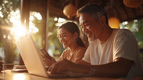 Enjoying a productive afternoon together at a cozy cafe while working on laptops and engaging with mobile devices