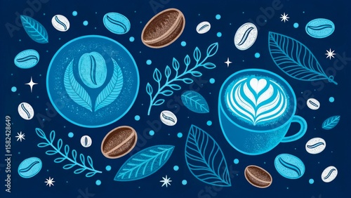 Enjoying coffee art with decorated beans and leaves on a dark background