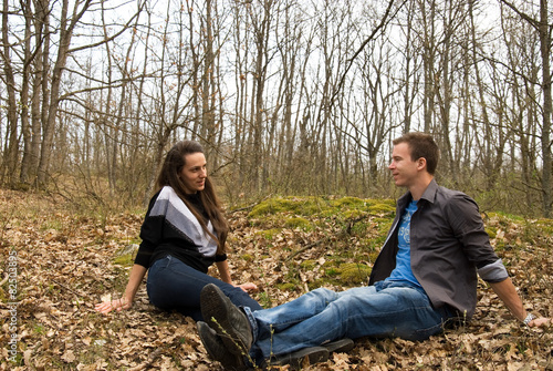 family, man, woman, love, sitting, understanding, tenderness, forest, young, young couple, tree, early spring, grass, people, nature, outdoors, day, horizontal, color image