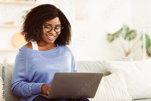 Enjoying The Day. Smiling black girl in eyewear typing on her laptop keyboard, sitting on couch, free space