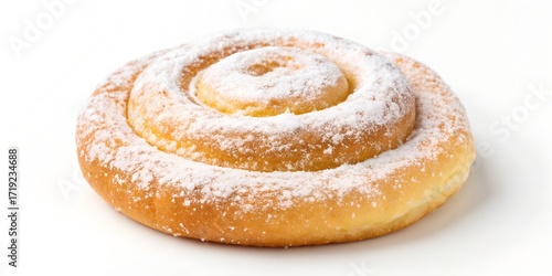 Ensaimada, spiral-shaped pastry dusted with sugar, isolated on pure white background