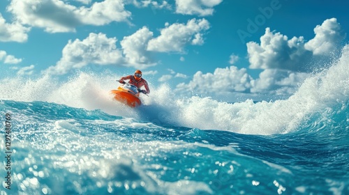 Enthusiastic Water Sports Adventure with Jet Ski on Vibrant Ocean Waves Under a Bright Blue Sky