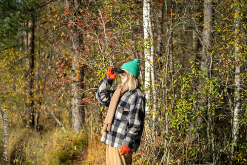 Enthusiastic woman with binoculars in hands, studying birds and watching nature in sunny chilly autumn woodland. Birdwatcher and monitoring of biotopes, environmental care and conservation