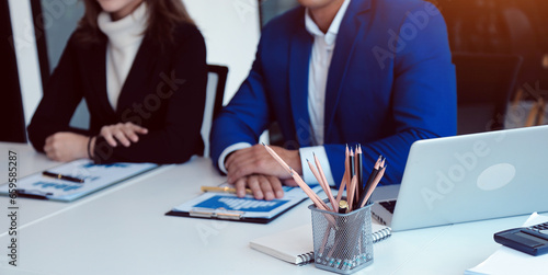 Entrepreneur Asian businessman and businesswoman discussing new business project in tablet in modern Meeting In Modern Office, Asian business casual concept.