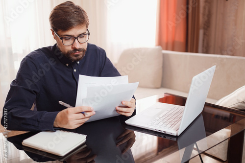 entrepreneur, man, online, paper, home, office, document, work, computer, happy, smart, laptop, course, business, phone, paperwork, men at work, people, student, alone, hot drink, person, invest, self, application, engineer, architect, reading, formation, information, job, trainee, report, intern, looking, workspace, conference, consulting, designer, file, architecture, boy, desktop, interior, new, research, watching, web, photogenic