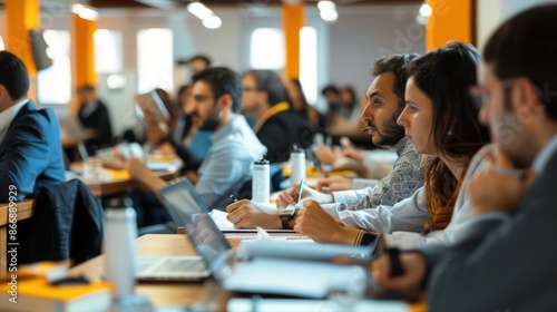 Entrepreneurs attending a pitch workshop, taking notes and practicing their presentations in a bright seminar room