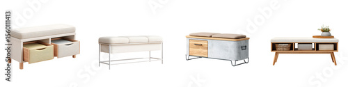 bench, storage, furniture, hallway, entranceway, home decor, interior design, decor, furnishing, modern, contemporary, wood, fabric, cushion, drawer, box, room, apartment, home, stylish, design, isolated, white background, collection, set, organisation, seating, decorative, practical, indoor, minimalist, white, light, studio