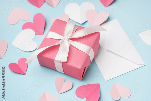 Envelope with gift box and paper hearts on blue background. Valentine's Day celebration