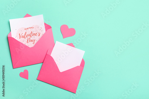 Envelopes with gift cards and paper hearts on turquoise background. Valentine's day celebration