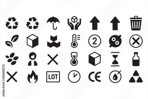 Environmental and Safety Icons: Black and White Symbols for Recycling and Packaging