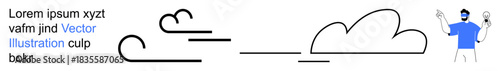 Environmental awareness, climate change, air quality, sustainability, ecology, health. are clouds, wind lines and a person holding a mask. Environmental awareness and air quality