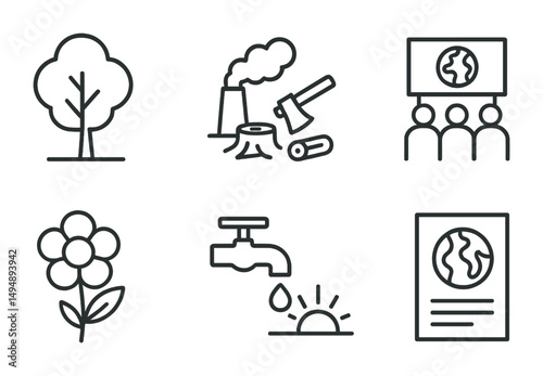 environment, nature, line, outline, icon, set, vector, flat, solid, awareness, conservation, earth, water, recycling, climate, ecosystem, sustainability, renewable energy, green, flora, fauna, pollution