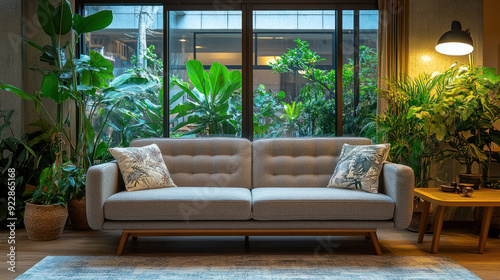 Environmental Friendly Sofa, Eco-friendly sofa made from recycled materials, showcased in a cozy living room setting with indoor plants, soft lighting, and a natural decor style.