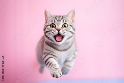 Environmental portrait photography of a happy american shorthair cat sprinting against a pastel or soft colors background. With generative AI technology