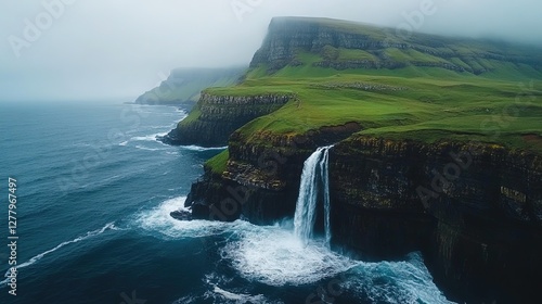 Epic cliffside landscape with a waterfall plunging into the ocean below