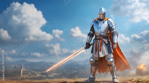 Epic Knight Battle Scene Fantasy Realm Digital Artwork Majestic Landscape Heroic Viewpoint Valor and Honor Themes