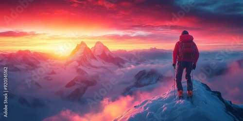 Epic Sunrise Ascent: Mountaineers Scale Majestic Peak, generative ai