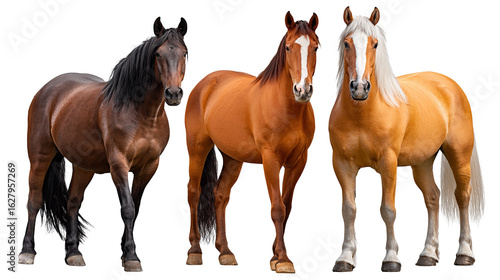 Equestrian Trio: A striking composition of three majestic horses, each showcasing unique coat color and elegant posture, embody the power and grace of equine beauty.