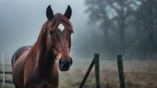 Equine close-up gazing at the camera amidst a misty backdrop