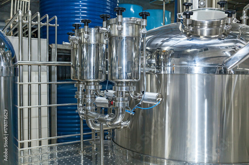 equipment for beer production, private brewery, Contemporary large steel barrels in winery, food industry