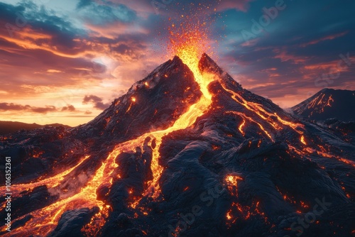 Erupting Volcano at Dusk with Lava Flow