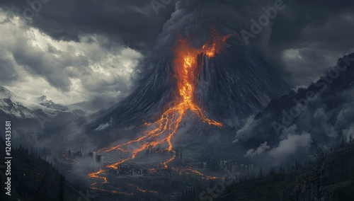 Erupting Volcano Destroying Town, Dramatic Mountain Landscape