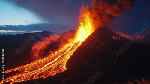 volcano, eruption, lava, ash, night, sky, smoke, mountain, nature, landscape, fire, heat, geothermal, red, orange, explosion, activity, earth, environment, power, scenic, dramatic, breathtaking, geologic, terrain, natural, beauty, force, dynamic, glow, lava flow, crater, solid, rock, destruction, wilderness, silhouette, adventure, risk, extreme, geology, photo, natural phenomenon, atmospheric, awe, vibrant