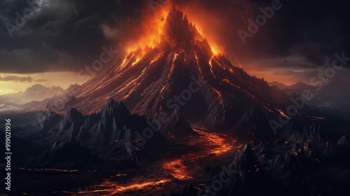 volcano, mountain, lava, eruption, fire, magma, landscape, nature, rock, dark, sky, hill, volcanic, earth, geologic, geology, hot, danger, peak, crater, fiery, dramatic, awesome, powerful, force, hazard, energy, natural, phenomena, intense, red, orange, grey, black, brown, fantasy, artwork, illustration, digital, art, artistic, painting, drawing