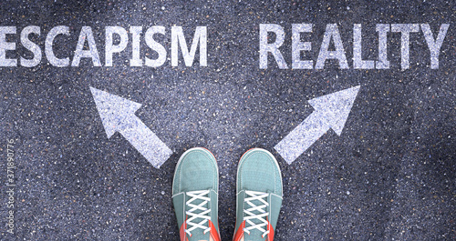 Escapism and reality as different choices in life - pictured as words Escapism, reality on a road to symbolize making decision and picking either Escapism or reality as an option, 3d illustration