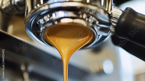 Espresso being poured from a coffee maker in close-up. Expert coffee brewing