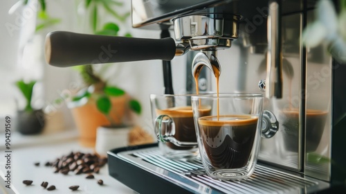 Espresso Machine Pouring Coffee into Glass Cups