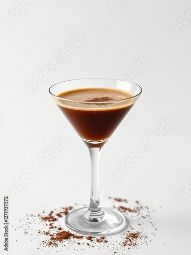 espresso martini with cocoa powder garnish on a white background, cocktail, brown drink, cocoa powder
