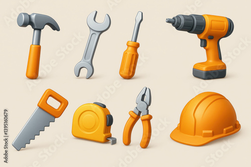 tool, construction, icon, three-dimensional, set, hammer, drill, wrench, screwdriver, plier, saw, tape, measure, hard hat, equipment, design, visual, craft, carpenter's shop, engineering, bricolage, home, repair, maintenance, collection, safety, utility, orange, hardware, labor, industry, mechanic, handy, essential, project, layout, job, instrument, object, graphic, creative, symbol, craftsmanship, building