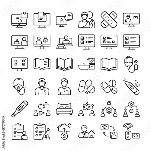 Essential Healthcare Icons: A comprehensive collection of minimalist line art icons representing various aspects of health, medicine, and well-being.