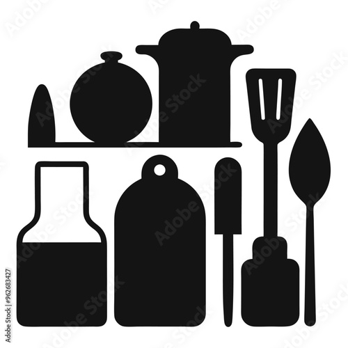 kitchen, tool, silhouette, utensil, vector, design, cutlery, cookware, illustration, icon, graphic, spoon, knife, fork, whipped, spatula, ladle, pan, pot, tongs, peeler, grater, sieve, rolling pin, chopping board, colander, measuring cup, masher, scissors, brush, opener, jar, blender, timer, bowl, strainer, juicer, mixer, tray, kitchen utensile, appliance