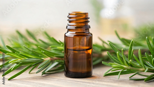 Essential Oil Bottle Surrounded by Fresh Green Rosemary Leaves on Wooden Surface
